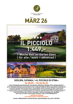 Das Golfresort liegt inmitten eines alten Parks an den Hängen des Ätna. Ein traumhafter »verwunschener« Platz, ein »Hidden-Kleinod« mit einem Palazzo aus dem 16. Jahrhundert als Clubhaus. Für viele noch ein Geheimtipp veranstalten wir hier seid 8 Jahren unser Frühlingstrainingslager. Der Platz ist ideal für Einsteiger geeignet, weil nicht so lang. Aber mit spektakuären, teilweise engen Bahnen bietet er auch eine echte Challenge für bessere Spieler. In der Umgebung gibt es zahlreiche Trattorias und gastronomische Hightlights mit regionalen kulinarischen Köstlichkeiten, abseits der Touristenströme. Ausflüge auf den Ätna, nach Taormina oder ins benachbarte Weingut runden die Woche perfekt ab. Familiengünstig in der Schulferienwoche vor Ostern gelegen – max. 12 Teilnehmer.