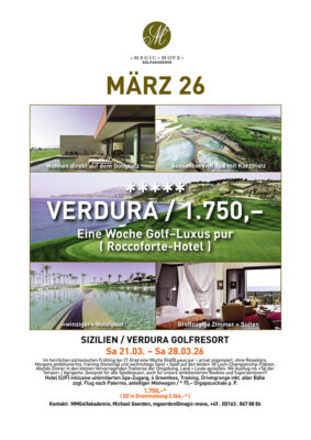 Luxus pur im modernen Verdura Golfresort an der Westküste in der Nähe von Agrigento. Ein Roccoforte 7–Sterne–Golftempel mit zwei 18 Lochplätzen / European-Tour-Destination!!!! Top-gepflegt, fast schon unanständig luxuriös, traumhaftes Umland und zahlreiche »geheime« regionale kulinarische Highlights – ob Fisch, Fleisch oder Pizza – hier tafelt der Einheimnische ;-))) und eher was für Mittelstufe und Advanced–Golfer. Sie ist auch für Golfsingles buchbar.