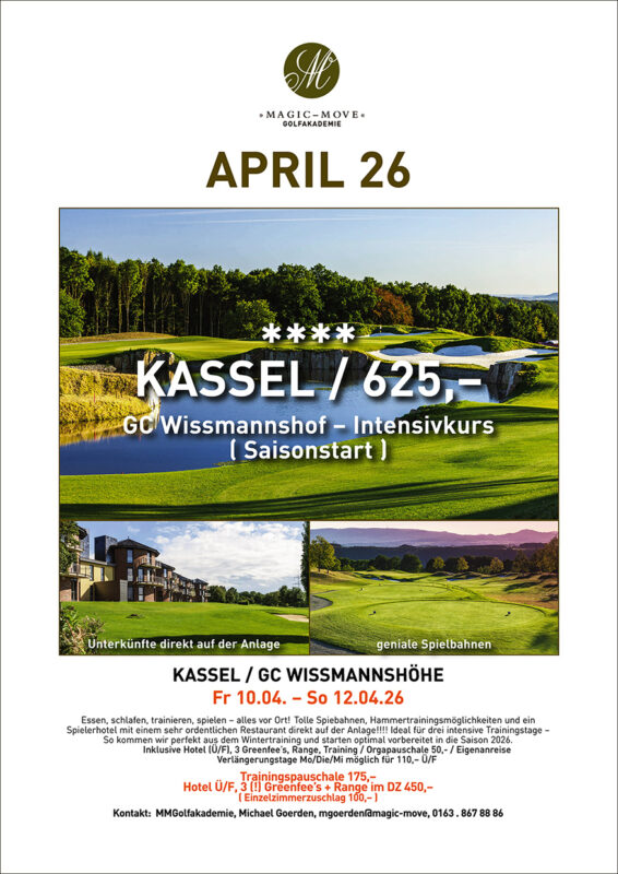 *175,- € Trainings- und Orgapauschale p.P. / 200,- € Hotel und Essenkosten / zzgl. Greenfee’s optional 9 oder 18 Loch
